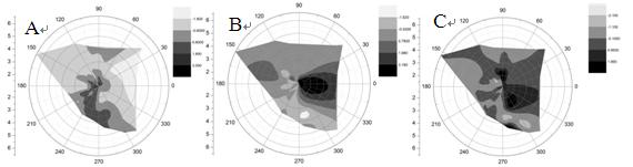 图6 EHM-X200大气重金属监测仪监测数据PM2.5中元素主成分分析得到的各组分与风向关系图。图A是组分1(工业、生活燃料燃烧)的浓度与风向关系图,从图中可以看出组分1主要来源于监测点位的西南方向(深色区域);图B是组分2(冶金工业废气)的浓度与风向关系图,从图中可以看出组分2来源于监测点自身范围内(深色区域);图C是组分3(扬尘)的浓度与风向关系图,从图中可以看出组分3主要来源于监测点位的东方及北方(深色区域)。图中颜色深浅由浅到深代表污染的程度由小到大。
