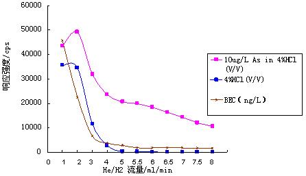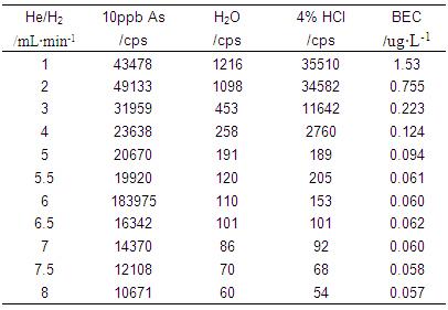 仪器首先在标准模式下进行参数优化(利用10μg·L-1的Li、Co、In、U、Ce调谐液对仪器工作参数进行调节,使仪器灵敏度最高,同时氧化物及双电荷产率小于3%);再开启He/H2碰撞反应气,逐步增大He/H2流量,测试超纯水、4%HCl及10μg·L-1 As(4%HCl介质)在75amu处的响应信号,计算其背景等效浓度(详细数据见表1及图1);并利用As标液进一步优化He/H2流量,得到仪器工作参数如表2所示。