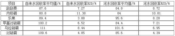在自来水和河水中加入0.5ug 6种有机磷混标,分别作三次平行样,按处理样品的方法进行样品前处理,GC-MS 6800测试,采用外标法定量,计算其回收率,数据见下表:
